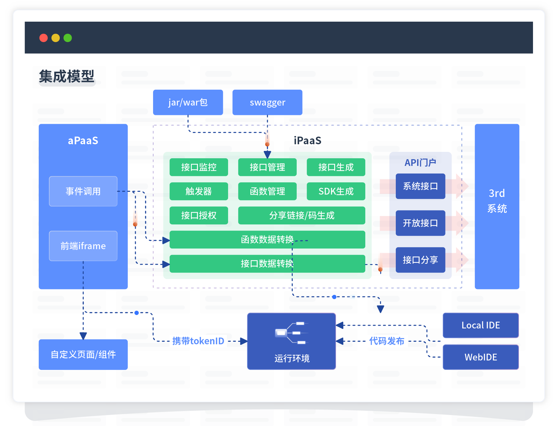 集成模型包括平台本身前、、、、、、、、、、、、、、、后端能力的扩展,,,,,,,,,,也支持通过API门户和第三方系统进行交互。。。。。。。。。。