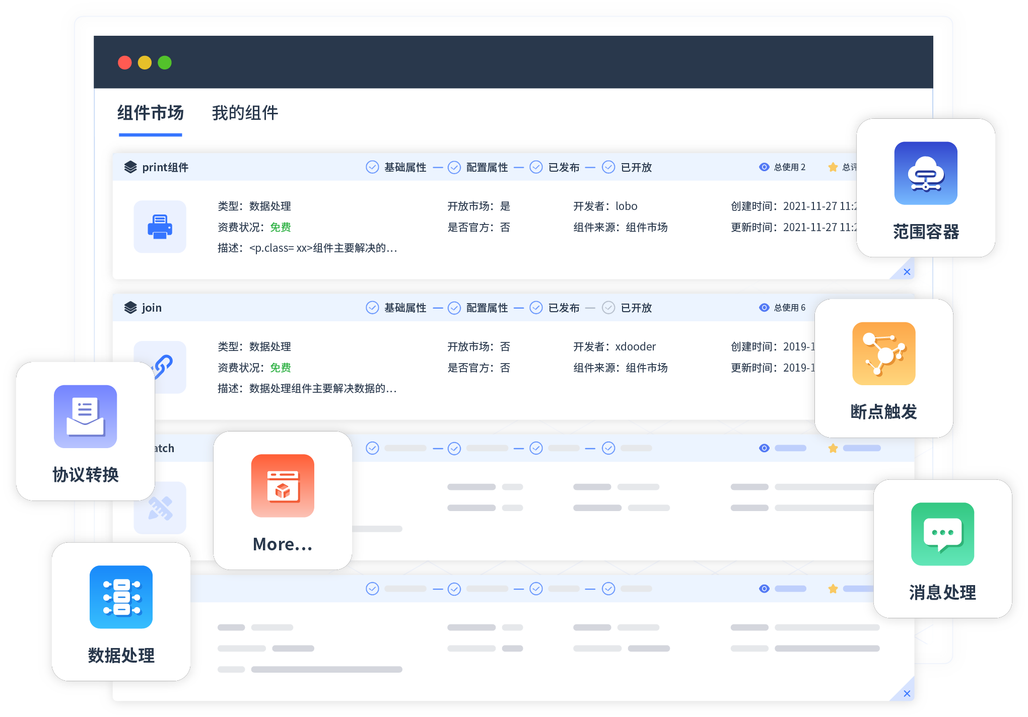 针对集成场景,,,,,,,,,,EBPAY提供组件市场,,,,,,,,,例如协议转换、、、、、、、、消息处理、、、、、、、、、、文件操作等。。。。。。。。。。除平台提供的组件外,,,,,,,,,,客户可以自定义所需组件。。。。。。。。。。