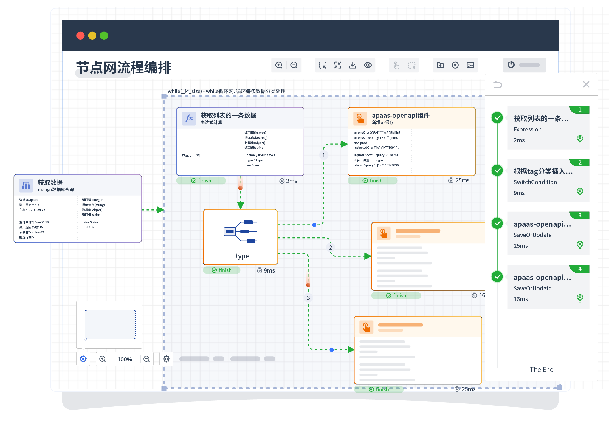 针对集成场景,,,,,,,,,组件定义后支持进行流程编制,,,,,,,,不同于传统代码方式,,,,,,,,通过图形化展示,,,,,,,,支持在线调试、、、、、、、、、日志查看和运行回放。。。。。。。。。。。。。。