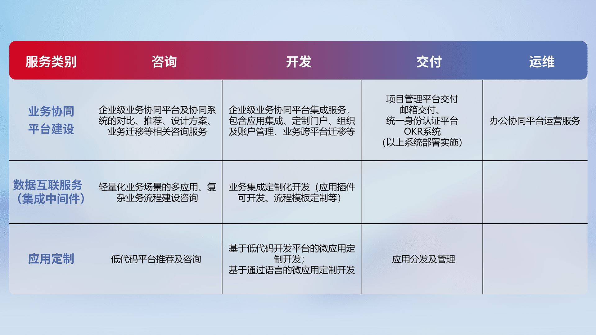针对钉钉、、、企微、、、、IDaas等平台级产品提供产品的规划、、、、方案、、、、交付、、、定制化开发等服务,,,,实现如统一协同办公、、、智能客户服务、、、、混合会议管理、、智能数据查询、、、、等业务场景,,,实现数字化转型。。。。