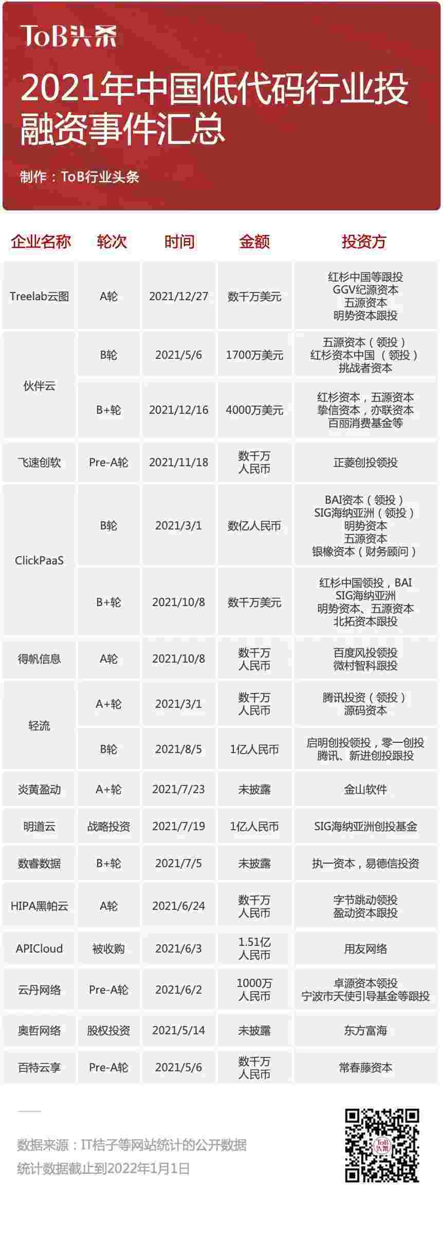 到2021年,,,,,,,,,,无/低代码投融资规模势头更甚,,,,,,,,,,,,,其中包括轻流两轮融资(A+轮数千万人民币,,,,,,,,,,,,B轮近亿人民币)、、、、、、、EBPAY 两轮融资(B轮数亿人民币,,,,,,,,,B+轮数千万美元)、、、、、、百特云享数千万元Pre-A轮融资......