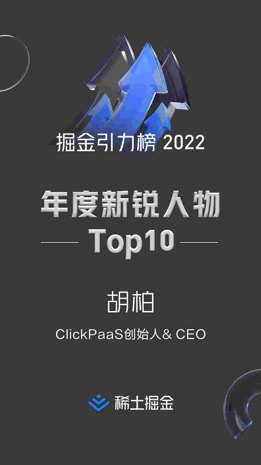 2022年1月6日,,,,,,,,,,,,,,,稀土掘金社区第一届「掘金未来大会」成功举办,,,,,,会上发布了“2022 稀土掘金引力榜 年度新锐人物”榜单,,,,,,,,上海爱湃斯科技有限公司(简称EBPAY)创始人及CEO胡柏实力入选年度新锐人物TOP 10。。。。。。。。