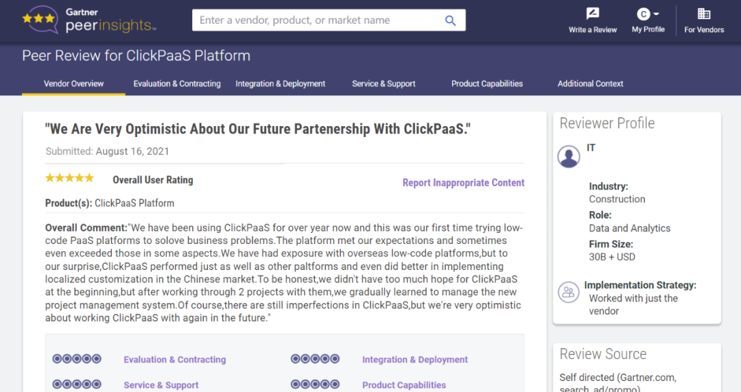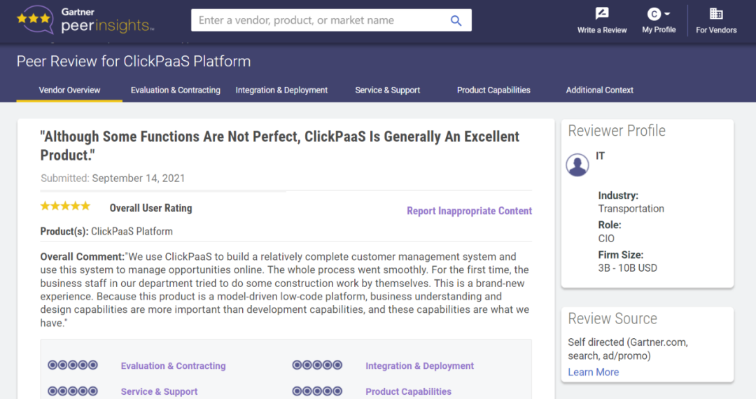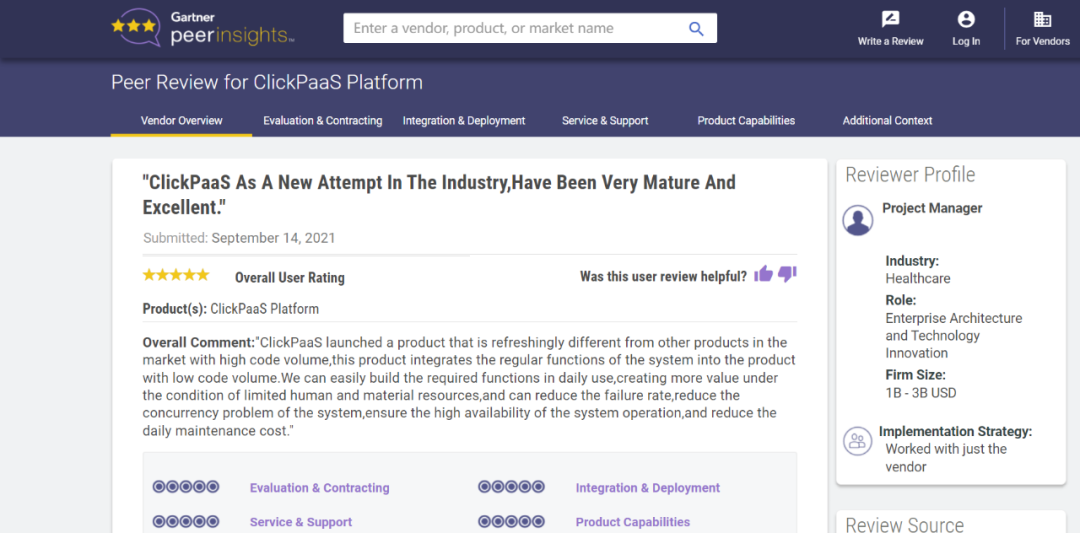 Tips:::::::::::【Peer Insights】——用户对企业IT产品和服务发布真实评价的平台。。。。。目前已有355个市场,,,,,,,,,,,255,000条经过验证的评价。。。。。。。。。。。。。每一条评价Gartner会针对参评企业营收规模及参评人员信息做验证、、、、、、评价内容做多维核实。。。。。。