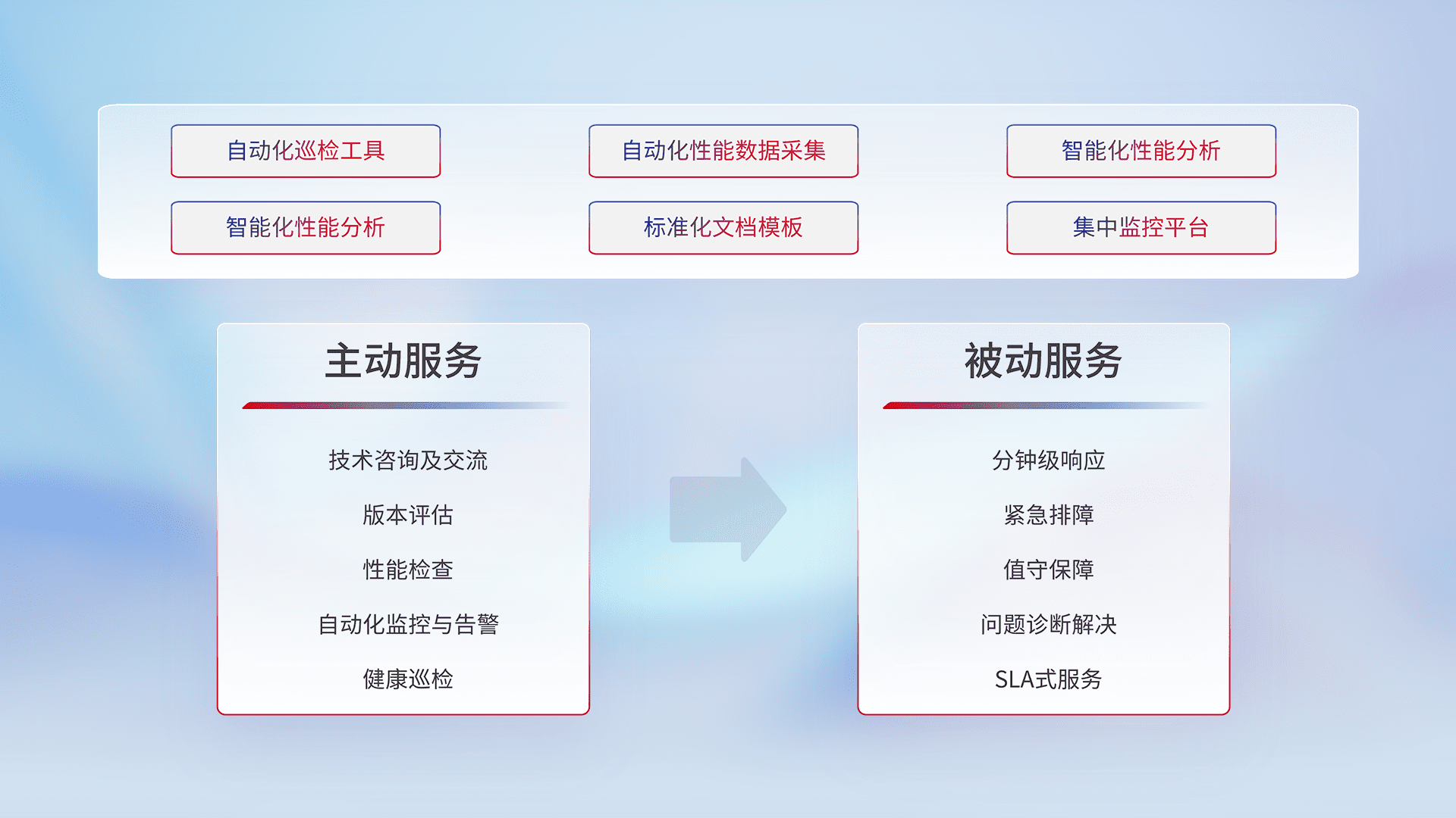 智能化工具和标准化文档,,,,保障服务质量,,提供主动服务(包含技术咨询、、版本评估、、、性能检查、、自动化监控与告警、、、、健康巡检)和被动服务包含(分钟级响应、、、紧急排障、、、、值守保障、、、问题诊断解决、、、、SLA服务)。。。